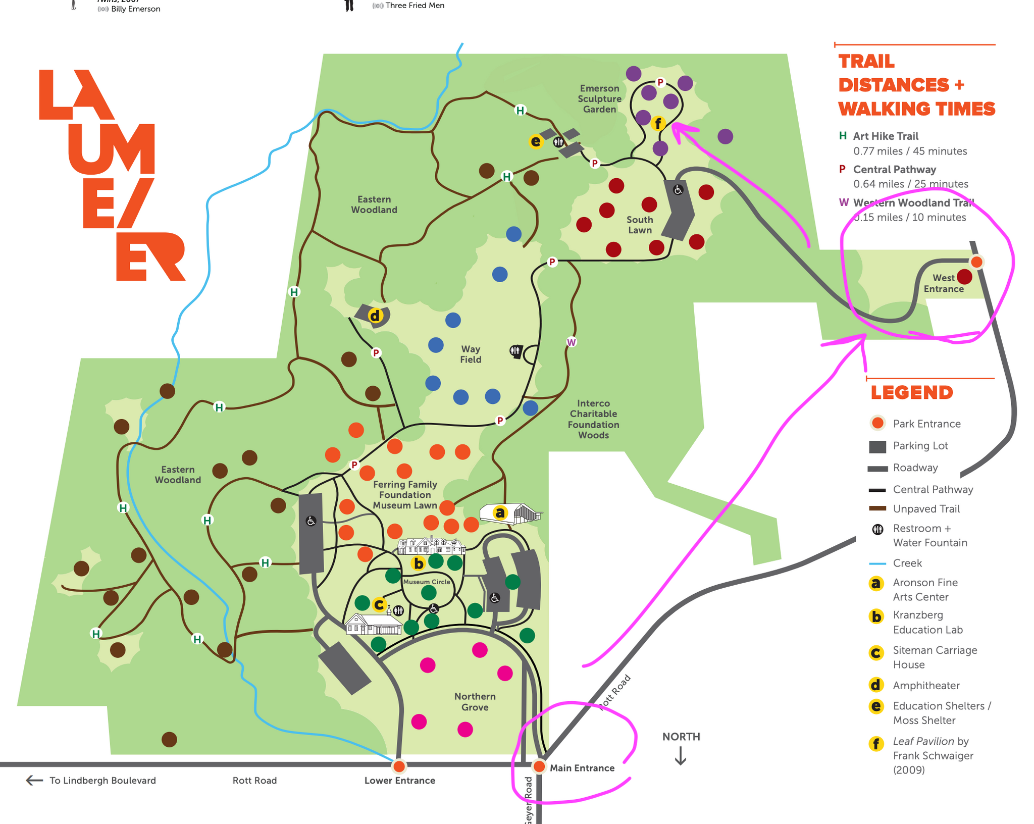 Go past the main entrance, stay on Rott Rd. Park at the West Entrance and follow the path to Emerson Sculpture Garden. Reference the map in the photos.Ā